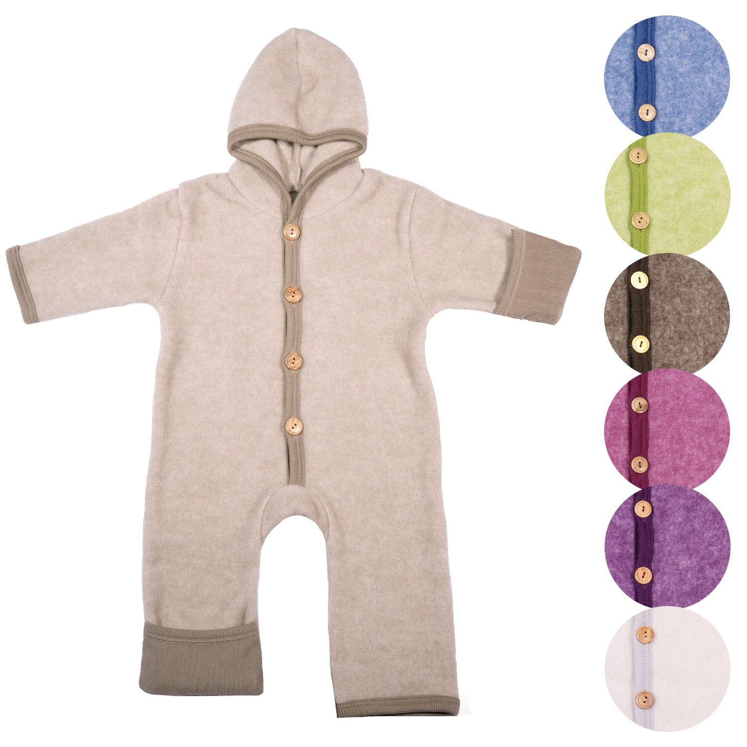 Baby Overall mit Kaputze und Umschlag aus Schurwoll-Baumwollfleece von Cosilana.